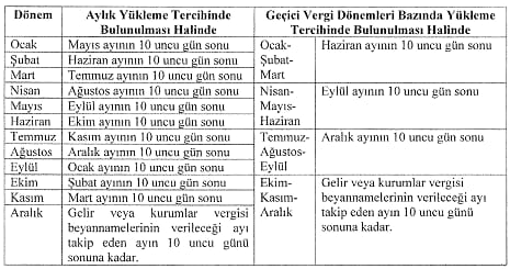 MADDE 4- Aynı Tebliğin 4.3.4 numaralı fıkrasının 1 numaralı bendinde yer alan “üçüncü ayın son gününe” ibaresi “dördüncü ayın 10 uncu günü sonuna”, 2 numaralı bendinde yer alan “ayın son gününe” ibaresi “ayı takip eden ayın 10 uncu günü sonuna”, 3 numaralı bendinde yer alan “ayın” ibareleri “ayı takip eden ayın 10 uncu günü”, “son dönem geçici vergi dönemine” ibaresi “hesap döneminin üçüncü geçici vergi dönemini takip eden üç ayına” şeklinde ve aynı bölümde yer alan tablo aşağıdaki şekilde değiştirilmiş ve ikinci paragrafının sonuna aşağıdaki cümle eklenmiştir.